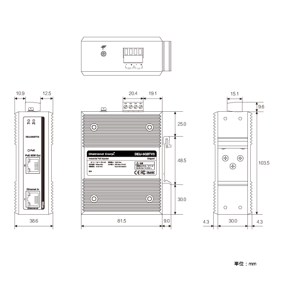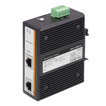 DEIJ-5GBTV3は、DC12〜52Vの幅広い入力電源に対応したミッドスパン方式の産業用PoEインジェクターです。 IEEE802.3af/at/bt準拠のため、最大90Wの大容量給電を実現します。 10BASE-T/100BASE-TX/1000BASE-T/2.5GBASE-T/5GBASE-T対応のイーサネットポートが搭載されています。 動作温度範囲は-40〜75℃と広域であるため、過酷な環境下でも使用可能です。 DINレール、壁掛け取り付けに対応できます。
