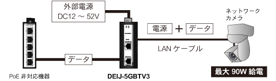 DEIJ-5GBTV3に電源(DC12~52V)を接続すると、データを送受信しながら最大90Wの電力をPoE対応デバイスに給電することができます。